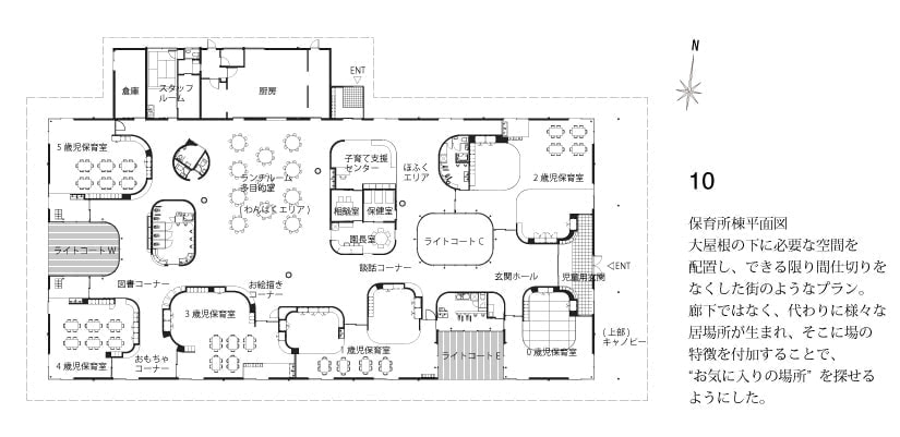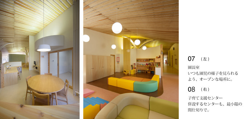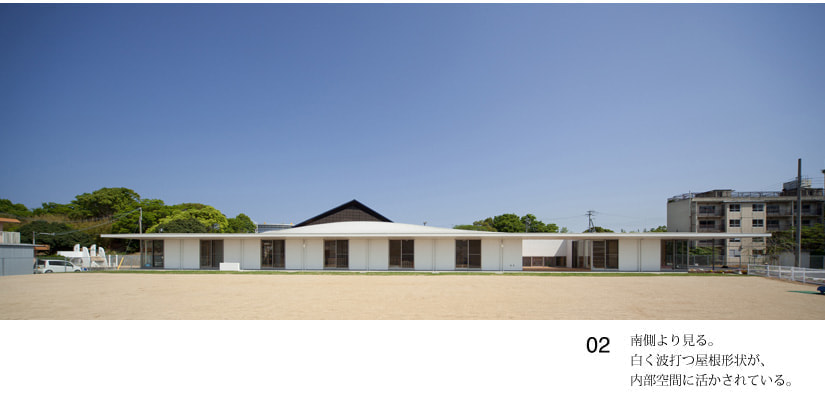 地域の中の保育所として子育てを新しいテーマで提案したいと考え生まれた建築である。