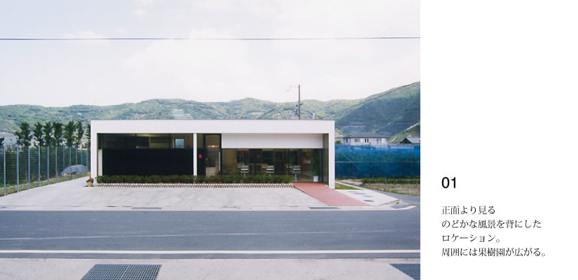 打放し仕上げとした鉄筋コンクリート造平屋建てで、前面道路に対して大きく開いたガラスのファサードが特徴。