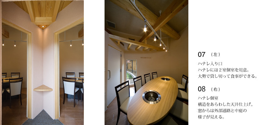 家族や仲間達とゆっくり食事ができるよう、メインホールと、完全個室のハナレによって構成した。